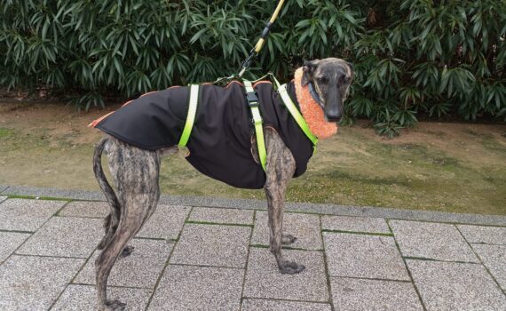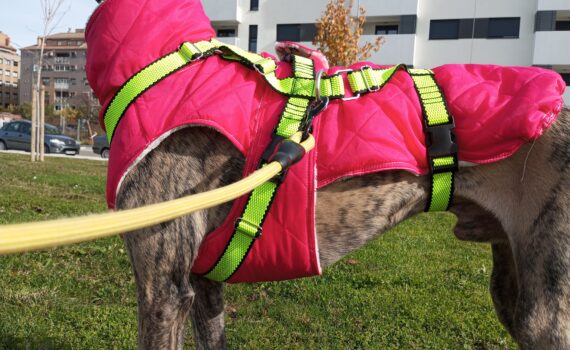 Práctico chaleco para galgo que le permite correr y estar abrigado al mismo tiempo. 38€ IVA incluido Se ata con corchetes